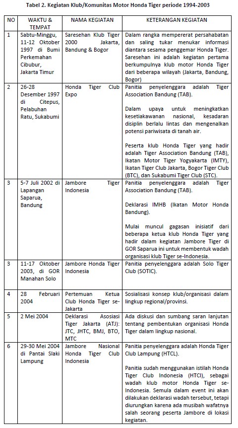 Pada periode 1993-2004, terdapat sejumlah kegiatan yang mempertemukan berbagai klub/komunitas Honda Tiger dalam rangka mencapai 3 tujuan utama: (i) membentuk dan meningkatkan rasa persaudaraan dan solidaritas diantara sesama pemilik motor Honda Tiger, (ii) memberikan manfaat sosial yang positif dari keberadaan klub/komunitas motor Honda Tiger bagi masyarakat luas, dan (iii) meningkatkan kesadaran dan kedisiplinan para pemilik Honda Tiger terhadap keamanan dan keselamatan berkendara di jalan raya. Kegiatan klub/komunitas motor Honda Tiger yang berskala besar dan mendapat liputan media massa pada periode 1994-2003 disajikan pada Tabel 2. Kegiatan-kegiatan ini bisa dianggap sebagai upaya pengkondisian untuk menghimpun klub-klub motor Honda Tiger ke dalam organisasi berskala nasional (Indonesia).