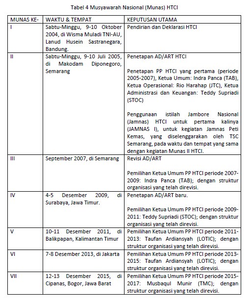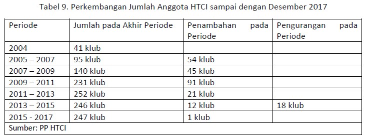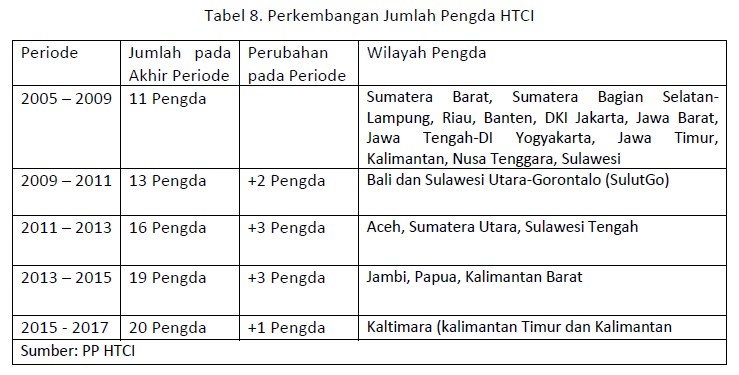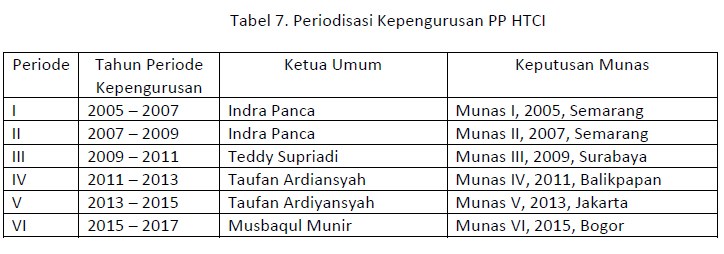 - Periodisasi Kepengurusan PP HTCI Kepengurusan PP HTCI ditentukan untuk periode 2 (dua) tahun. Proses pemilihan Ketua Umum PP HTCI dilakukan dalam forum Musyawarah Nasional. Peserta Munas adalah perwakilan Pengurus Daerah (Pengda) HTCI, yang memiliki hak suara untuk memilih calon Ketua Umum yang diajukan oleh Pengda. Periodisasi Kepengurusan PP HTCI selama ini disajikan pada Tabel 7.