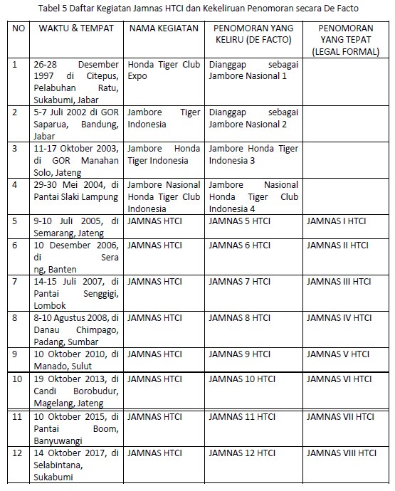 - Jambore Nasional (JAMNAS) HTCI Kegiatan Jamnas merupakan ajang pertemuan para anggota klub motor Honda Tiger, yang bertujuan untuk memelihara dan meningkatkan rasa persaudaraan sesama pengguna Honda Tiger. Sebelum HTCI terbentuk (oktober 2004), telah ada kegiatan pertemuan klub-klub motor Honda Tiger, yang kemudian dianggap sebagai Jambore, sehingga penomorannya diurut berdasarkan kegiatan-kegiatan tersebut. Perlu diakui secara jujur dan terbuka, bahwa telah terjadi salah kaprah penomoran kegiatan Jambore Nasional (Jamnas), yang berdampak pada penomoran yang kurang tepat untuk kegiatan Jamnas HTCI.