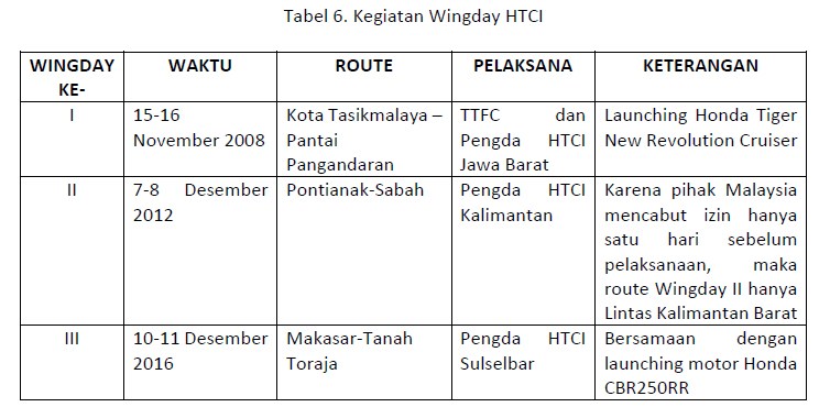 - WINGDAY HTCI Kegiatan Wingday HTCI merupakan ajang pertemuan para anggota klub motor Honda Tiger, yang memiliki karakteristik yang berbeda dengan kegiatan Jamnas HTCI. Karakteristik khas Wingday HTCI meliputi 2 aspek, yaitu: (i) Waktu pelaksanaan diselenggarakan setiap 4 tahun, dan (ii) Lokasi keberangkatan (start) dan tempat tujuan (finish) merupakan 2 lokasi yang berbeda.